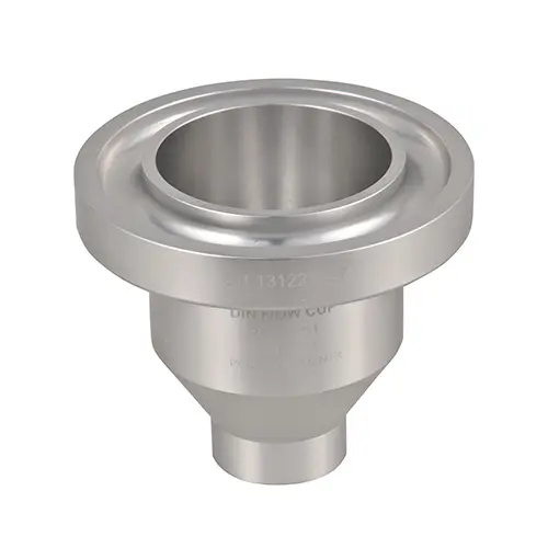 DIN flow cup meters are viscosity meters to determine the viscosity of liquids. The flow cups are often used in industry and research laboratories. Due to the form of the measuring method, however, the determination is only carried out on low-viscosity liquids, since the liquid cannot run off through the nozzles if the viscosities are too high. Liquids with Newtonian behavior therefore give the most accurate results in the flow cup. The viscosity can be determined on the basis of the flow volume and the measured time that the liquid needs to run through the nozzle from the flow cup. The start time begins when the liquid emerges at the lower edge of the nozzle. It is stopped as soon as the liquid no longer flows evenly or the liquid breaks off.