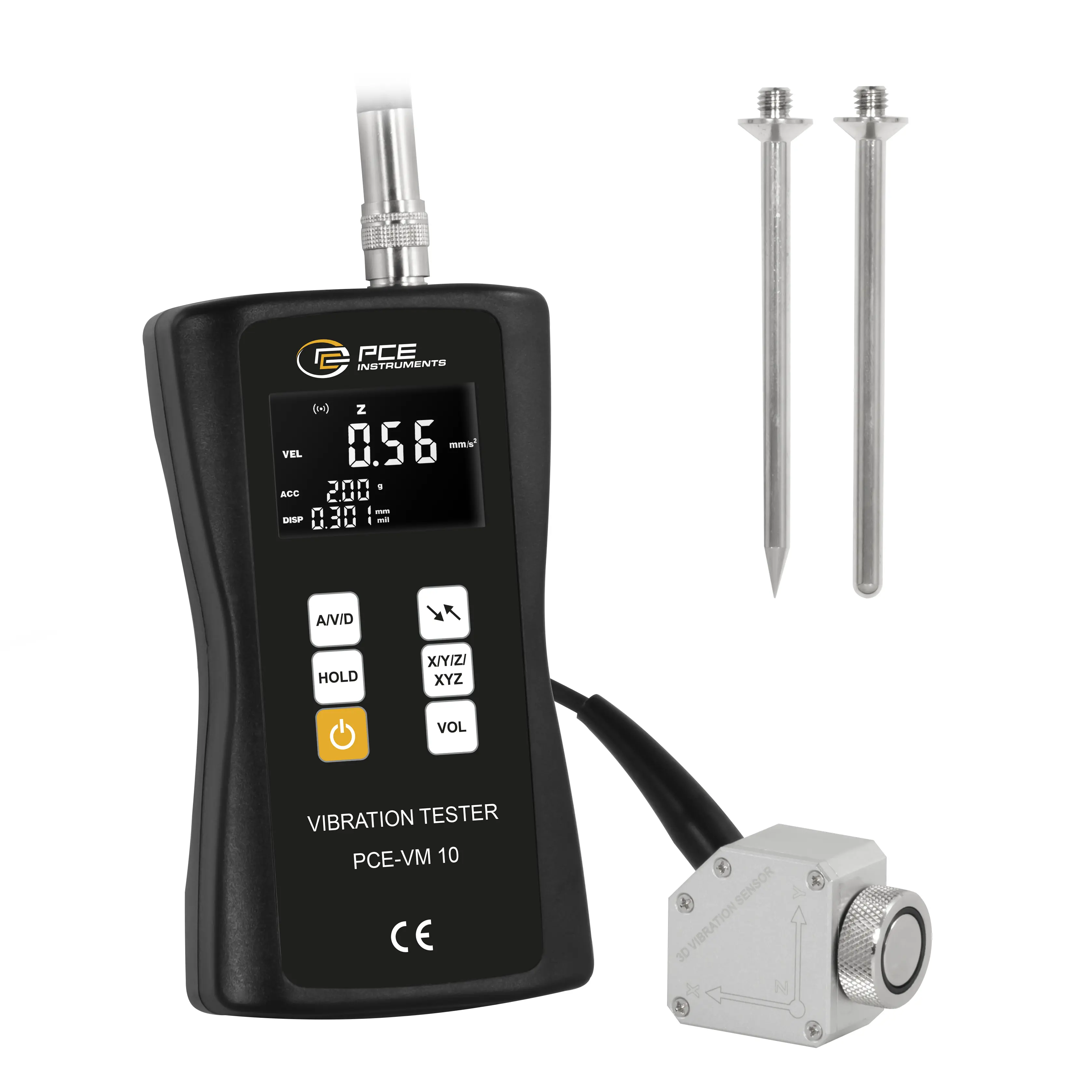 The 3-Axis Accelerometer has a 3-axis piezoelectric accelerometer with three mounting options: a magnetic sensor and two measuring tips (one conical and one spherical) that can be attached to the sensor. These accessories enable precise and versatile vibration measurements on various machines and surfaces. This makes the device a handy and powerful tool for industrial vibration measurements. It supports various units such as mm/s, inch/s, m/s², g, ft/s², mm and mil and has a measurement function that displays the maximum measured values.
