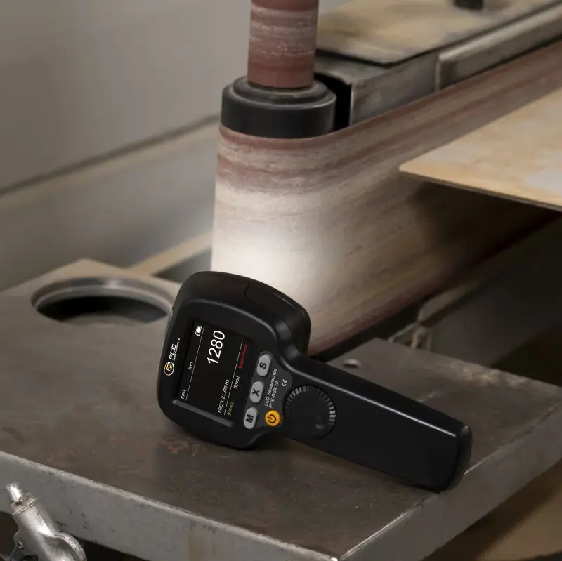 The rev counter utilises the so-called " stroboscope effect" to analyse fast movements, vibrations or periodic processes. With the help of 9 high-intensity LEDs, the speed measuring device generates short flashes of light with an illuminance of up to 1500 lx. These flashes of light are emitted in synchronisation with the frequency of the movement to be monitored until the object appears to stand still to the observer. The digital stroboscope allows the user to focus on specific phases or features of the movement in order to detect defects or irregularities in rotating or oscillating parts.