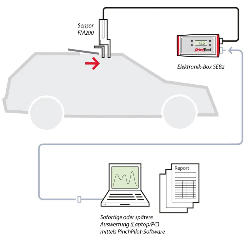 The force transducer is an electronic closing force measuring device for power-operated windows, sunroofs and tailgates in the motor vehicle sector. Typical areas of application are testing and production in the automotive industry. It is also increasingly being used by technical monitoring institutions. Its uncompromising design combines precision with practical robustness and ensures accurate measured values even after years of use in harsh environments.