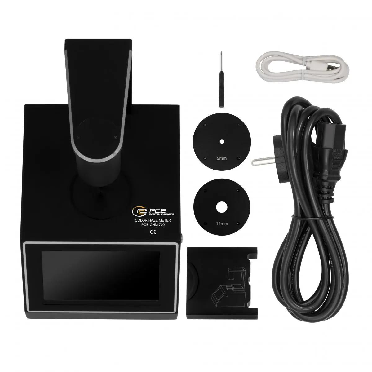 With two variable apertures of 14 mm and 5 mm, the transmission meter can measure samples of different sizes, while two measurement modes, horizontal and vertical, offer flexible application options for liquids and solids. For the vertical measurement of liquids, the use of cuvettes with the dimensions 50 × 50 × 10 mm (H × W × D) is required; these are not included in the scope of delivery. The measuring geometry D/0° and observer angles of 2° and 10° enable precise and reliable analyses. The Colorimeter has an internal memory for up to 1000 data sets, a PC interface with USB-C connection and PC software for data export and report generation.