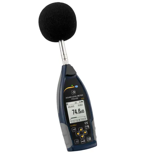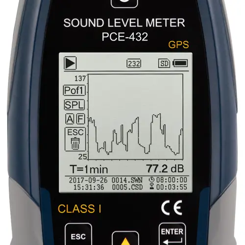 PCE-432 is a class 1 data-logging sound level meter that meets IEC 60651:1979, IEC 60804:2000, IEC 61672-1:2013, ANSI S1.4-1983 and ANSI S1.43-1997 requirements. This portable high-accuracy sound level meter is equipped with GPS functionality, allowing measured values to be assigned to an exact geographic location.