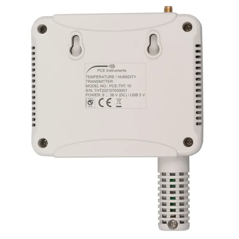 The WiFi data logger is supplied with power via the 12 V DC mains power converter or the micro-USB interface. For wall mounting, there is a hole on the back to hook the thermo-hygrometer to screws. The thermo-hygrometer is equipped with an ISO calibration certificate.