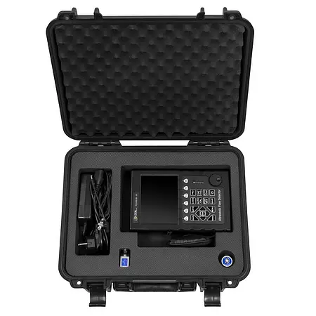 The ultrasonic tester is a powerful measuring device that has been designed for appropriate tests. Robust and ergonomic design enables use under industrial conditions. Weighing just 1.1 kg, the defectoscope can not only be used as a desktop device but is also suitable for mobile use.