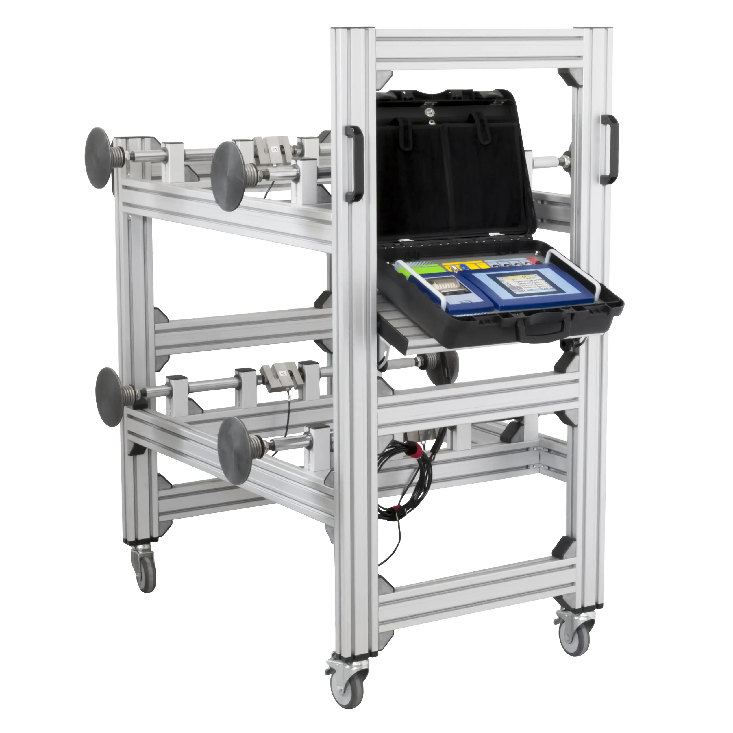 Each of these 4 force sensors can record a maximum force of up to 3t. The force is shown on the color display of the 4-point measuring carriage with a resolution of 1 kg. The force of each individual sensor and the totals of several sensors are displayed and also shown as a percentage in relation to the total force. The forces can be displayed in kg / N / kN and lb.