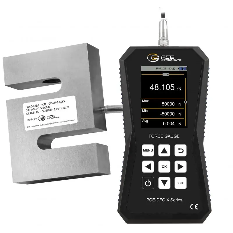 The internal memory of 32 GB offers space for 30 million measuring points. This allows measurement logs to be created, saved and exported. The force tester has a USB-C interface that can be used to read the measurement data into the PC software. The force gauge is equipped with a graphic LCD that displays the measured values both numerically and graphically. In addition, a bar chart shows the measured value in the selected measuring range. The measuring cell is protected to IP67 and can therefore also be used in harsh industrial environments.