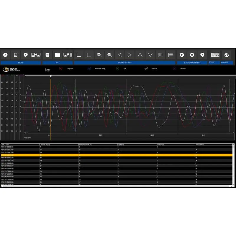 The hygrometers of the PCE-VDL series are available in two versions. The hygrometer PCE-VDL 16I contains sensors for the following physical units: temperature, humidity, air pressure, light and 3-axis acceleration.