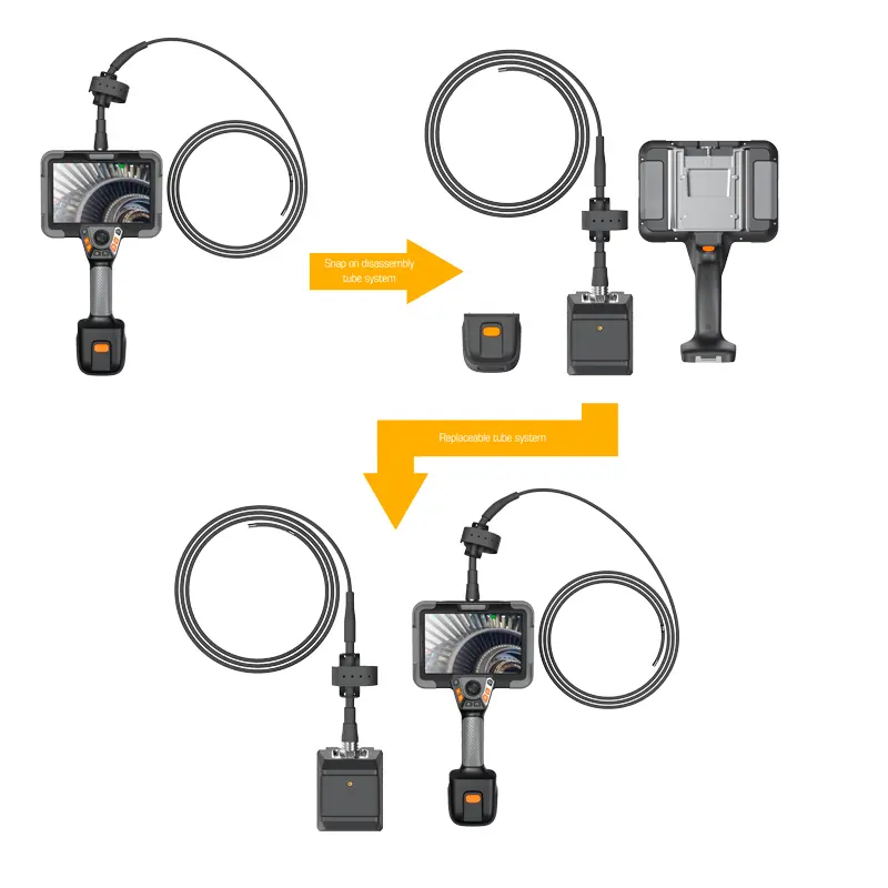 Another special feature of this inspection camera series is the motor for controlling the camera head. Motor, camera cable and camera have been designed as a complete unit so that the connection to the handheld device works quickly and easily. The camera unit can be easily and securely attached to the handset and released again if necessary.