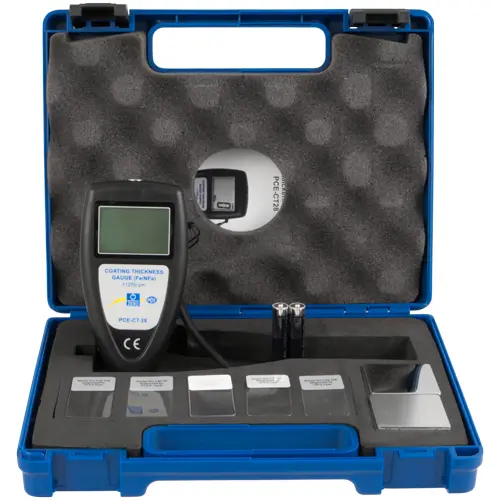 The material thickness meter for cars is for measuring the thickness of paint and plastic on ferrous or non-ferrous materials without damaging the coating's surface. The material thickness meter stands out due to its high range of measurement. This material thickness meter works excellently as a tool for technicians in areas of paint or lacquering such as in production, automotive body repair or quality control. The material thickness meter is particularly useful in detecting damage to vehicles produced by an accident, for preventing possible damage or as a toll in auto body repair. Also, in the industrial sector, this device is essential for quality control in shipping and receiving and during production. It is ergonomic with an integrated sensor and it shows results of measurements quickly and accurately. The material thickness meter was designed for non-magnetic coatings such as plastic, chrome, zinc, copper, etc. and insulation such as rubber, plastic, glass and paper over steel, iron, aluminium, brass and stainless steel. Thanks to its wide measurement range, the material thickness meter is ideal for the naval and metal industries.