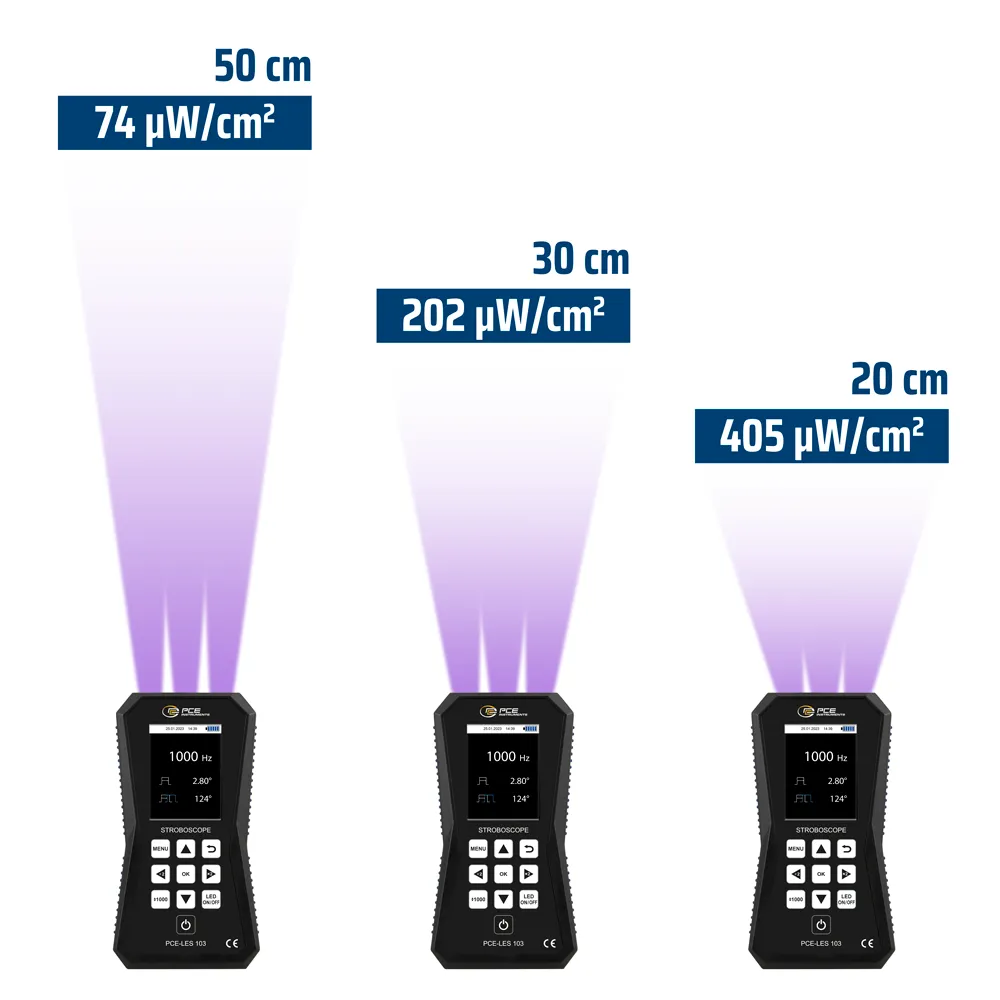 Motion analysis of rotating machines is quick and easy with our rotation meter. The rotation meter is equipped with 3 UVA high-power LEDs, which together generate a light intensity of 202 μW/cm² at a distance of 30 cm.