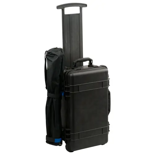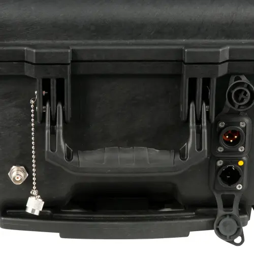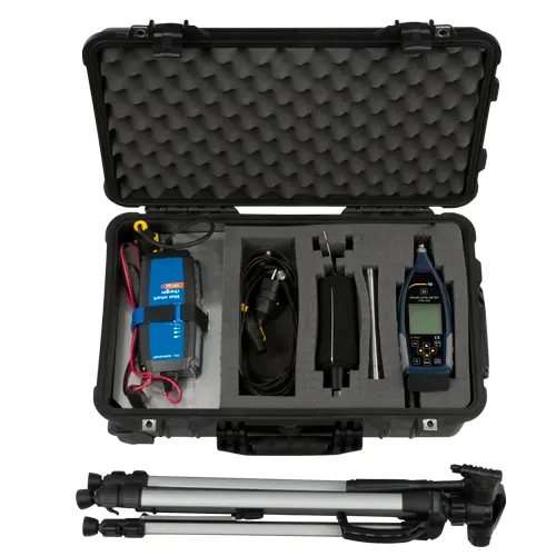 The additional kit for outdoor sound measurement PCE-4xx-EKIT can be combined with the sound level meters PCE-428, 430 or PCE-432. This kit makes it possible to measure the outdoor noise with a sound level meter over a long period of time. The environmental noise monitoring system consists of a waterproof Peli carrying case with rollers. A charger and two additional lead gel batteries are installed in this case, which allows an operation of the sound monitor for up to 10 days. During the outdoor sound measurement, the case may remain closed. Due to the external connections for the microphone and the power supply all electronic components are protected from water.
