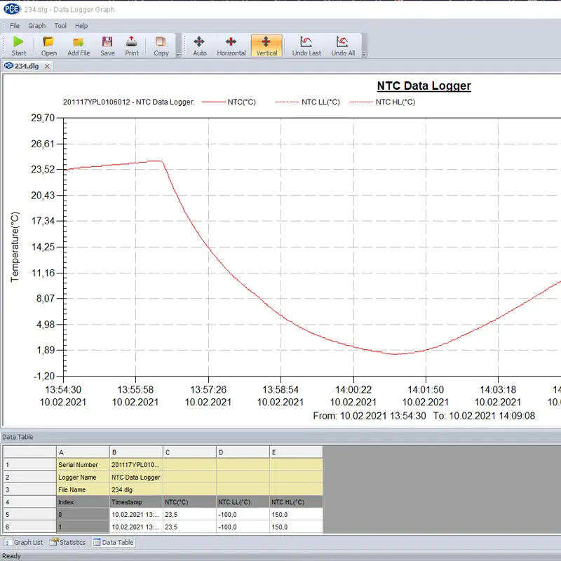 In order to evaluate the saved measured values, the thermometer generates a PDF file in addition to the series of measurements. The digital thermometer itself is recognized by a computer as a mass data storage device, which means that the PDF can be transferred directly from any computer. This has the advantage that reading out the measurement data is independent of the operating system. Further analyzes of the measurement data or settings of the thermometer can be carried out using the software supplied. In order to process the measurement data further, the measurement values ​​can be exported via the software as TXT, CSV or in XLS data format. It is also possible to export the graphic as JPG and BMP.