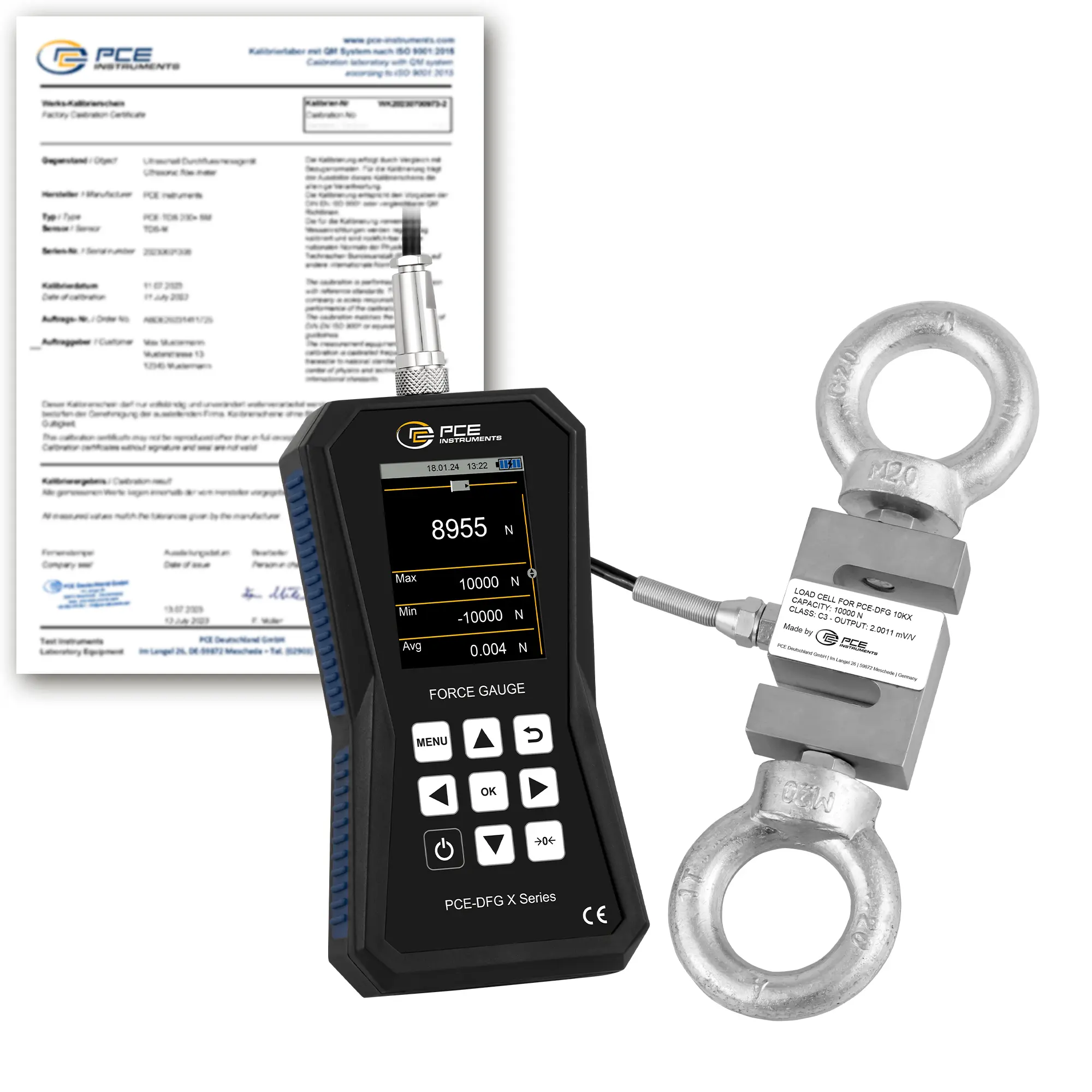 The internal memory of 32 GB offers space for 30 million measuring points. This allows measurement logs to be created, saved and exported. The Tension Tension Dynamometer / Tension Load Cell / Tension Load Cell has a USB-C interface that can be used to read the measurement data into the PC software. The Tension Tension Dynamometer / Tension Load Cell / Tension Load Cell is equipped with a graphic LCD that displays the measured values both numerically and graphically. In addition, a bar chart shows the measured value in the selected measuring range. The measuring cell is protected to IP67 and can therefore also be used in harsh industrial environments.