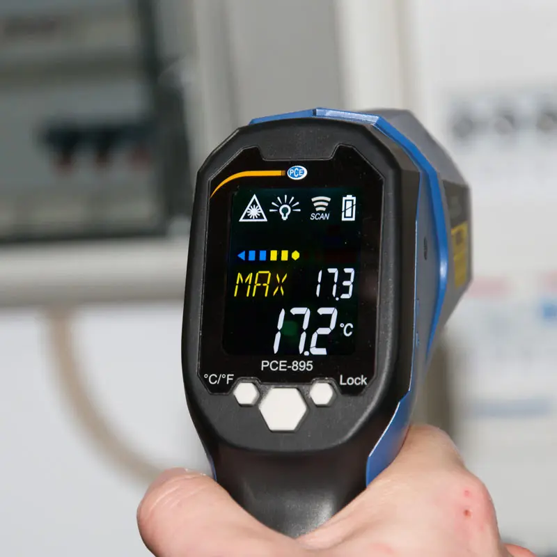 The Dual Laser Thermometer PCE-895 is used for fast surface temperature measurement. The two laser points of the dual laser thermometer PCE-895 mark the exact measuring point and thus offer excellent assistance with the temperature measurement. Due to the cross laser function, the two laser spots indicate exactly how large the actual IR spot is. The emissivity of the dual laser thermometer PCE-895 is adjustable in the range of 0.10 ... 1.0. Thus, the dual laser thermometer PCE-895 is suitable for almost all surfaces.
