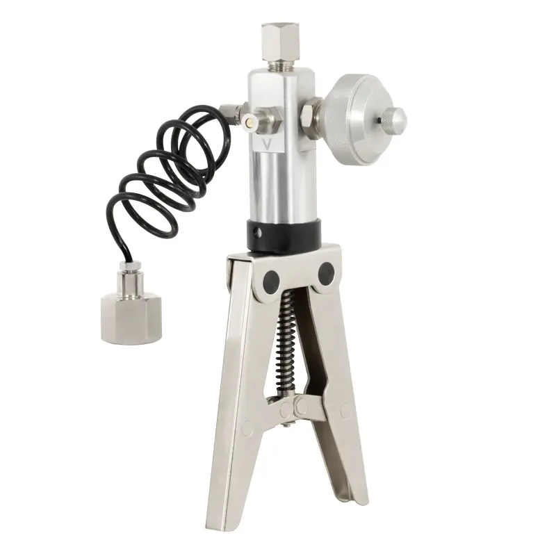 This vacuum pump can generate negative pressure/vacuum and pressures from 16 to 25 bar (depending on the model). An additional pressure gauge is required for reference measurement of the set pressure (optional). The fine adjustment on the valve allows each calibration pressure to be set accurately and quickly. This vacuum pump is ideal for testing measuring equipment, e.g. for testing pressure gauges and pressure transmitters. The reference device for accurate actual pressure measurement is screwed directly onto the hand pump.