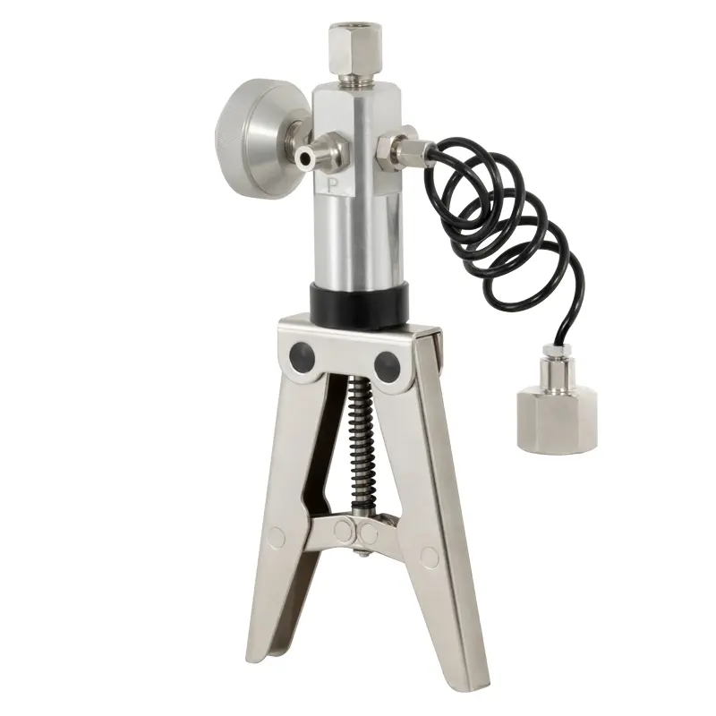 This vacuum pump can generate negative pressure/vacuum and pressures from 16 to 25 bar (depending on the model). An additional pressure gauge is required for reference measurement of the set pressure (optional). The fine adjustment on the valve allows each calibration pressure to be set accurately and quickly. This vacuum pump is ideal for testing measuring equipment, e.g. for testing pressure gauges and pressure transmitters. The reference device for accurate actual pressure measurement is screwed directly onto the hand pump.