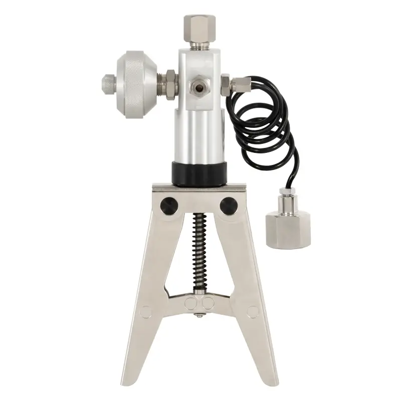 This vacuum pump can generate negative pressure/vacuum and pressures from 16 to 25 bar (depending on the model). An additional pressure gauge is required for reference measurement of the set pressure (optional). The fine adjustment on the valve allows each calibration pressure to be set accurately and quickly. This vacuum pump is ideal for testing measuring equipment, e.g. for testing pressure gauges and pressure transmitters. The reference device for accurate actual pressure measurement is screwed directly onto the hand pump.