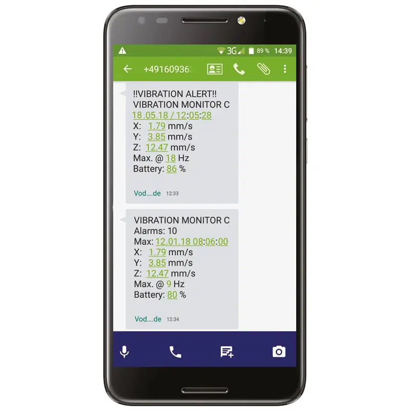 Modem 4G (LTE B3, B8, B20); 2G (E-GSM-900, DCS-1800), SMS transmission in alarm condition, contains measured values X / Y / Z, date, time and device name. Retrieving the alarm number and maximum value via SMS by calling the device.