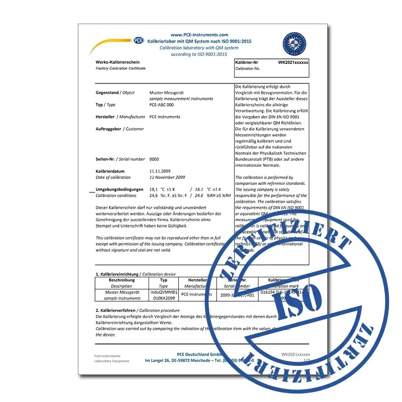 ISO calibration certificate for the current clamp/power meter PCE-PCM 1. The certificate for the clamp meter is often required to comply with DIN ISO 9000. For this we give the measuring device to our in-house calibration laboratory. You as the client, the measured values and the serial number are recorded in this ISO calibration certificate.