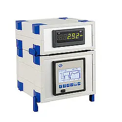 Table case for controller, display, screen recorder with the control panel cutout 905 x 905 mm. The table housing is supplied with an aluminum panel with a matching cutout. The table housing has mounting feet at the front. This makes it possible to conveniently read the measured values from the built-in mounting devices. Due to stacking troughs on the top several table cases oh can be stacked.