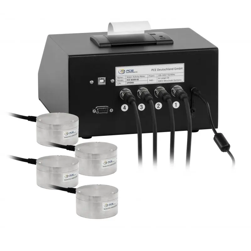 The Moisture Analyser / Moisture Analyzer enables the simultaneous or separate measurement of water activity on 4 channels. It measures water activity within a range from 0 ... 1 aw and temperature from -10 ... +50 °C. Our meter is equipped with a 7" touchscreen that displays the data in real time and saves it for later analysis. Results, graphs and measurement data can be called up at any time. Thanks to the professional sensor, the device provides very accurate results within 3 to 5 minutes.