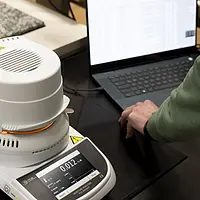 The precision balance enables accurate and simple moisture determination in a wide range of materials. The sample is automatically weighed, dried and the weight loss is displayed as moisture content. This measuring principle does not require any time-consuming creation of characteristic curves and is immediately ready for use shortly after set-up.