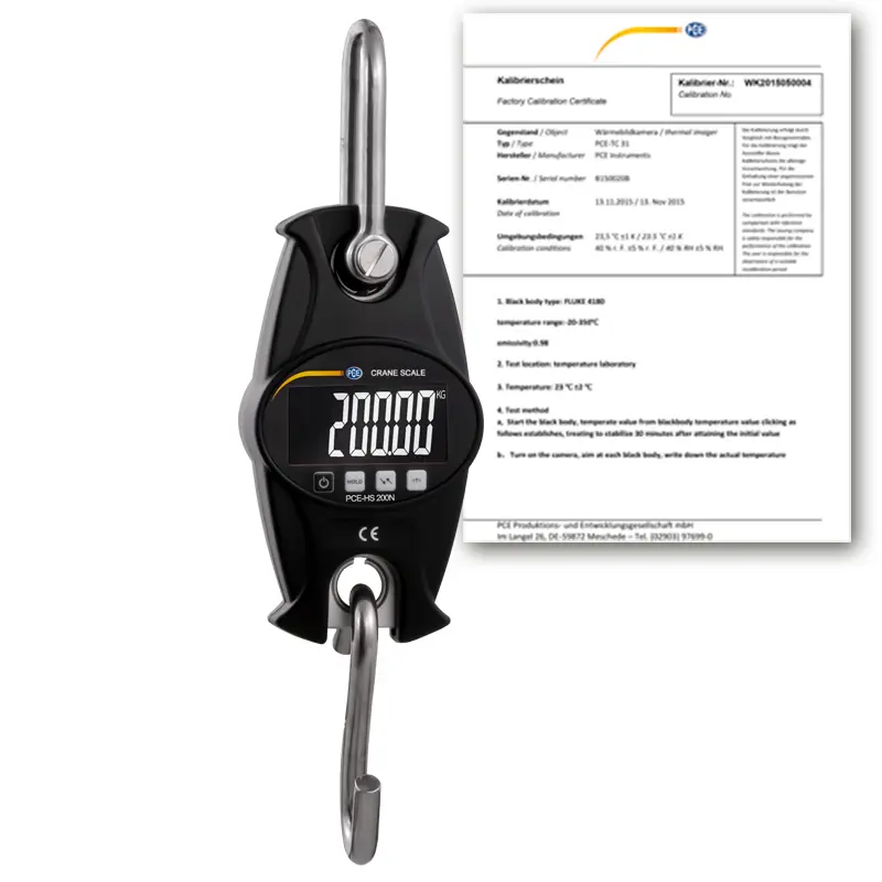 The Suspended Scale is operated with two 1.5V AAA batteries and can therefore be used mobile. To save the batteries, the hanging scale has an automatic switch-off after 15 minutes of inactivity. The hanging balance is equipped with an ISO calibration certificate from PCE Instruments.