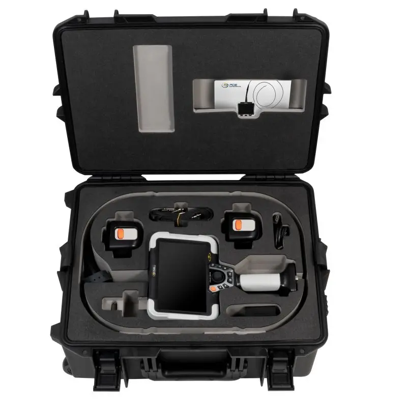 O boroscópio suporta gravações de imagens e vídeos nos formatos JPG e MP4, além da criação de relatórios de teste em PDF diretamente no dispositivo. Com a função de imagem em imagem, pré-visualização de câmara dupla e rotação de imagem, as inspeções podem ser realizadas de forma flexível. A operação é confortável através de um joystick elétrico e do ecrã tátil. Para armazenamento de dados, dispõe de 16 GB de memória flash interna e um cartão SD com capacidade até 128 GB. Interfaces como HDMI, USB-A e USB-C permitem a exportação fácil e a exibição dos dados em dispositivos externos.