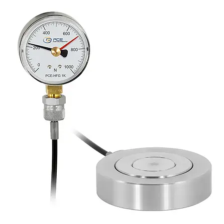 Dinamômetro hidráulico analógico / Faixa de medição 1 kN / Visor externo / Compacto para espaços reduzidos / Com ponteiro de arrasto / Inclui roscas de fixação / Abertura central de 27 mm