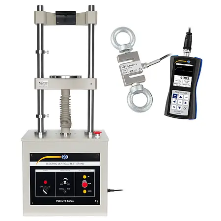 Máquina de ensaio motorizada até 5000 N, adaptável a todos os medidores de força da série PCE com célula dinamométrica interna e externa, curso longo, velocidade de avanço regulável