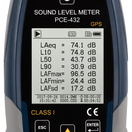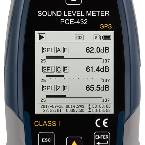 | Análisis de frecuencia | Filtro de banda de octavas: 8 Hz ... 16 kHz Filtro de banda de 1/3 de octavas: 6,3 Hz ... 20 kHz |