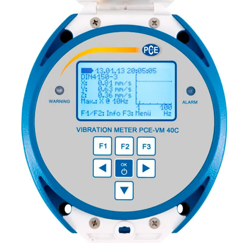 | Pantalla | LCD en blanco y negro, 128 x 64 píxeles, con iluminación de fondo, 3 valores máximos (X/Y/Z) o sumas de vectores, Frecuencia principal, Espectro FFT de 50 líneas, Estado de batería, Fecha y hora |