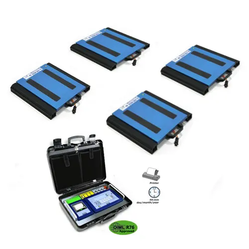 Esta balanza pesa ejes se usa principalmente para el pesaje de vehículos. Sin embargo, es apta para cualquier tipo de pesaje estático. La balanza pesa ejes se compone de 4 plataformas y una pantalla. La pantalla está integrada en una maletín portátil e incluye una impresora, lo que permite un uso muy flexible. Las plataformas de la balanza pesa ejes están fabricadas en un aluminio robusto, con un peso propio de aprox. 18 kg por plataforma.
