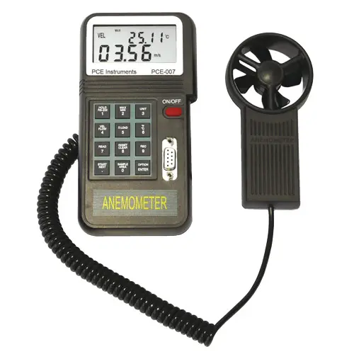 Dette sparer dig tid til trættende at notere værdierne og undgår transmissionsfejl. Det eksterne pumpehjul (på 1,5 m kabel) øger mobiliteten og fleksibiliteten med en nøjagtig måling af lufthastigheden. Disse vindmålere er en del af en ventilationsteknikers basisudstyr til justering og kontrol af ventilationsanlæg. Batteritiden er cirka 50 timer med et batteri med en strømstyrke på 300 mA/t. Ønsker du at lave en langtidsoptagelse med vindmåleren, som varer længere end 2 dage, skal der bruges batteripakker eller en AC-adapter.