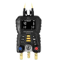 Densitetsmåleren er et robust måleinstrument til daglig brug på køleanlæg og varmepumper til måling af tryk og temperatur. Målingen med densitetsmåleren udføres ved hjælp af medfølgende kølemiddelslanger og 2 NTC-tangenttemperaturfølere. Ved simpel tilslutning eller fastgørelse kan alle måleparametre registreres samtidigt. Den 2-vejs ventilblok i metal med 3 tilslutninger og 3 slangeholdere muliggør hurtig og nem brug af densitetsmåleren. De 83 indstillede kølemidler kan vælges hurtigt og vises øverst på måleskærmen. Under målingen sikrer ophængsanordningen en sikker fastgørelse. Densitetsmåleren drives af 4 x 1,5V AA-batterier.