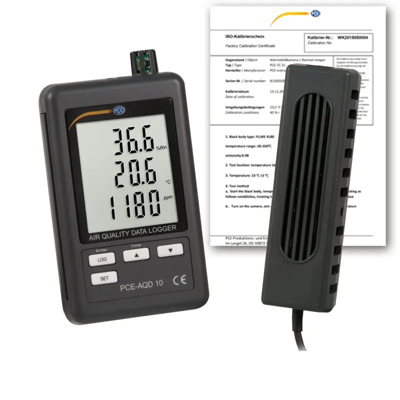 CO2-måleapparatet sikrer professionel registrering af luftkvalitet, er let at bruge og kan bruges fleksibelt, hvis det kræves. På grund af dets holdbare plastikhus og kompakte størrelse (132 x 80 x 32 mm) er CO2-måleren hurtigt klar til brug overalt, garanterer brugervenlig håndtering og høj nøjagtighed. CO2-måleapparatet er uundværligt for alle, der løbende ønsker at overvåge kvaliteten af rumluften. CO2-måleren bruges ofte, hvor der er mange mennesker i lukkede rum, for eksempel til at kontrollere luftkvaliteten på kontorer, skoler, museer eller lounger. CO2-måleren bruges også til at overvåge rumluften i industri- og landbrugsanlæg. Kombinationsmåleapparatet fra PCE Instruments bruges også af arkitekter, eksperter, aircondition-, ventilations- og varmesystembyggere. Den enkle betjening af CO2-dataloggeren gør den også ideel til brug i den private sektor. PCE Instruments tilbyder også ISO-kalibreringscertifikatet for fugt og temperatur for at overholde DIN ISO 9000. Kalibreringscertifikater udstedes specielt til kunder, årlig rekalibrering kan også udføres via PCE Instrumenter.