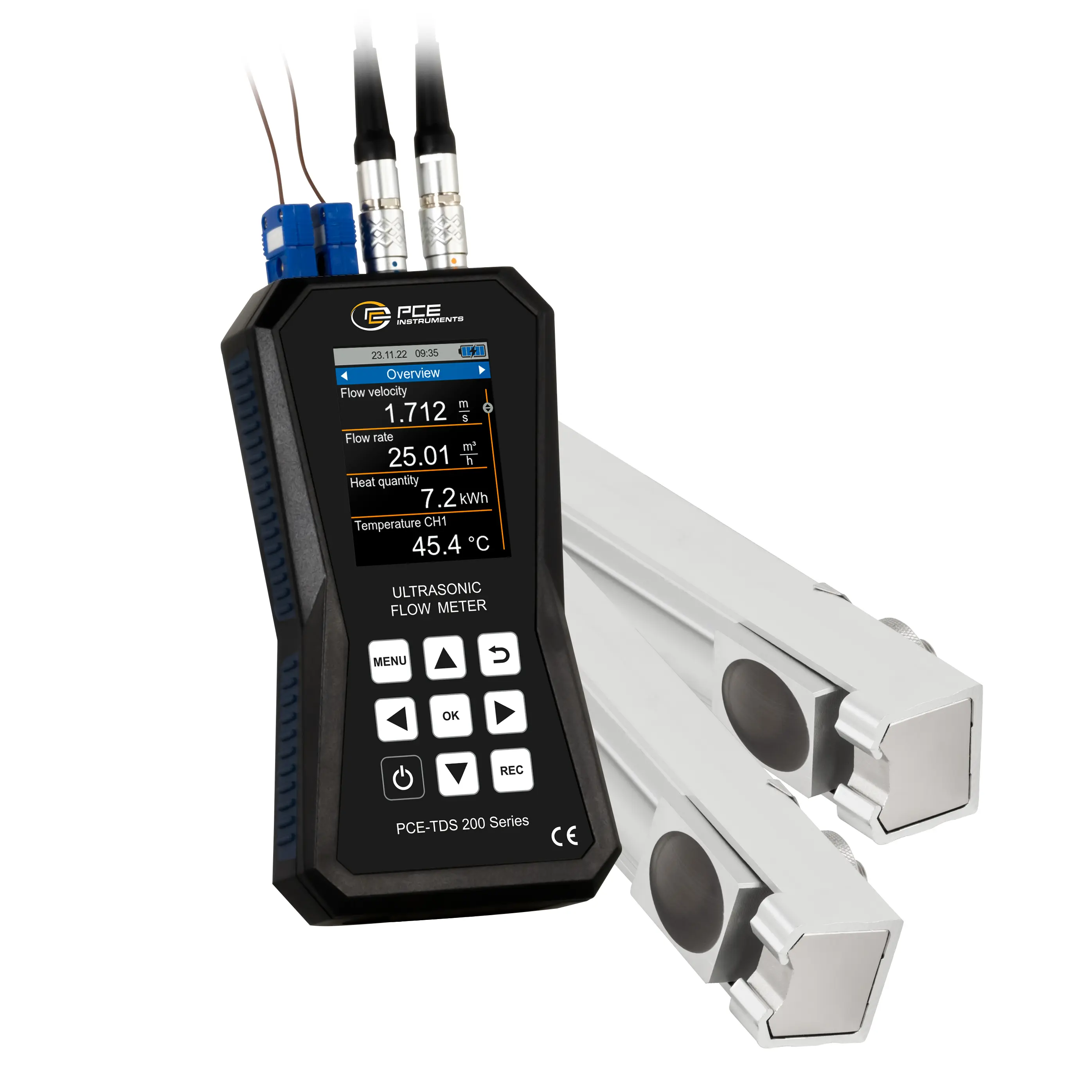 For at bestemme varmemængden med ultralydsflowmåleren kræves der to ekstra termoelementer. Disse er tilgængelige med PCE-TDS 200+. De to termoelementer på ultralydsflowmåleren er forbundet med flow og retur i et rørsystem. Baseret på temperaturforskellen og den målte flowhastighed kan ultralydsflowmåleren bestemme varmemængden. Hvis det er nødvendigt, kan ultralydsflowmåleren samtidig beregne og vise omkostningerne pr. varmemængdeenhed under målingen. Ultralydsflowmåleren bruges derfor f.eks. til at kontrollere varmesystemer.