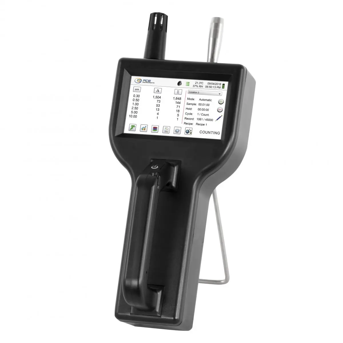 | Speicherkapazität (Zusatzinformation) | Ringspeicher bestehend aus Partikelzählung, Temp.- und Feuchte, Orte und Zeiten |