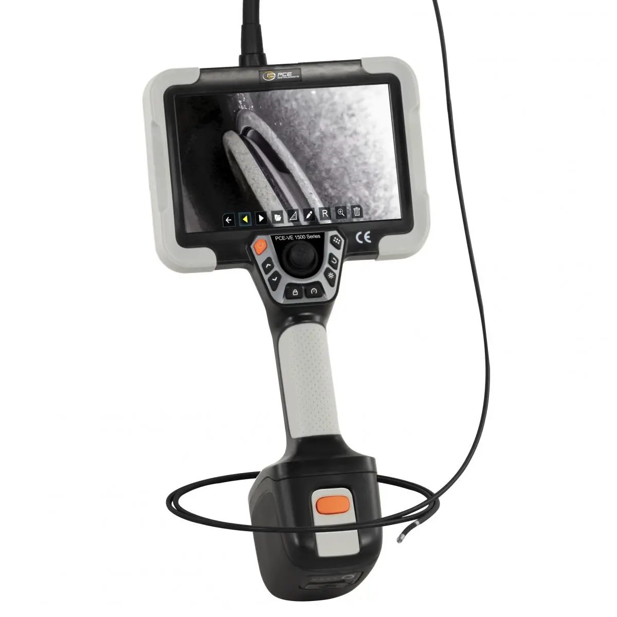 Dieses Boroskop ist als einziges Gerät der Serie PCE-VE 1500 mit zwei Kameras ausgestattet. Eine davon ist frontal ausgerichtet, die andere seitlich. Beide sind am Kamerakopf sehr dicht nebeneinander positioniert. Neben jeder der Kameras ist eine LED angeordnet, mit der das Blickfeld bei Bedarf beleuchtet werden kann. Einstellungen am Endoskop für die Bilddarstellung auf dem Display und für die Beleuchtung des Kamerablickfeldes werden jeweils für beide Kameras und beide Lichtquellen gleichzeitig wirksam.