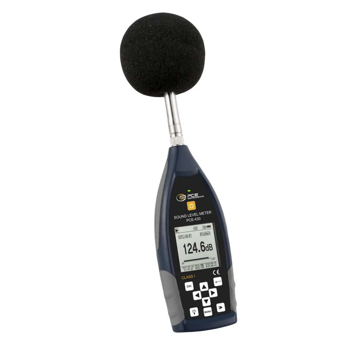 Das Schallpegelmessgerät PCE-430 der Klasse 1 erfüllt alle Ansprüche an die Lärmmessung und die Frequenzanalyse. Dieses integrierende Präzisions- Impuls- Schallpegelmessgerät folgt allen gültigen Normen und Richtlinien (Klasse 1 EN/IEC 61672, ANSI S1.4-1983, ANSI S1.43-1997 EN/IEC61260, etc.) Das Schallpegelmeter PCE-430 besitzt ein sehr großes beleuchtetes Display. Das Display vom Schallpegelmesser stellt den Schalldruckpegel numerisch und grafisch im Verlauf in Echtzeit an. Das Profi-Schallpegelmessgerät verfügt über einen integrierten Datenlogger. Die Messdaten werden auf einer Micro-SD Karte gespeichert.