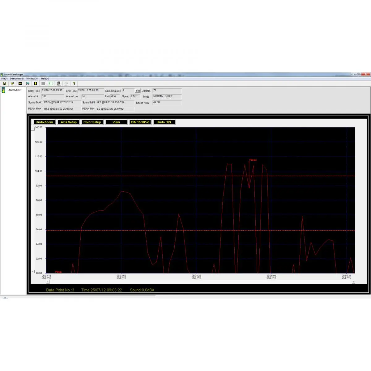 Ebenfalls erstellt die im Lieferumfang befindliche Software eine Grafik zur Verlaufanzeige. Zudem bietet die Software die Möglichkeit Alarmgrenzen einzustellen. Ein Über- oder Unterschreiten dieser Grenzwerte wird durch eine blinkende LED angezeigt. Die interne Echtzeituhr mit Datum erlaubt dem Benutzer eine genaue Zuordnung der Ereignisse. Ein besonderes Merkmal ist die Versorgung dieses USB Schallpegelmesser über eine langlebige interne 3,6 V Lithium- Batterie. Je nach Benutzung liegt die Lebensdauer dieser Batterie bei etwa einem Jahr. Der Stativanschluss und die Wandhalterung erlauben es den USB Schallpegelmesser auch Daten über einen längeren Zeitraum aufzeichnen zu lassen.