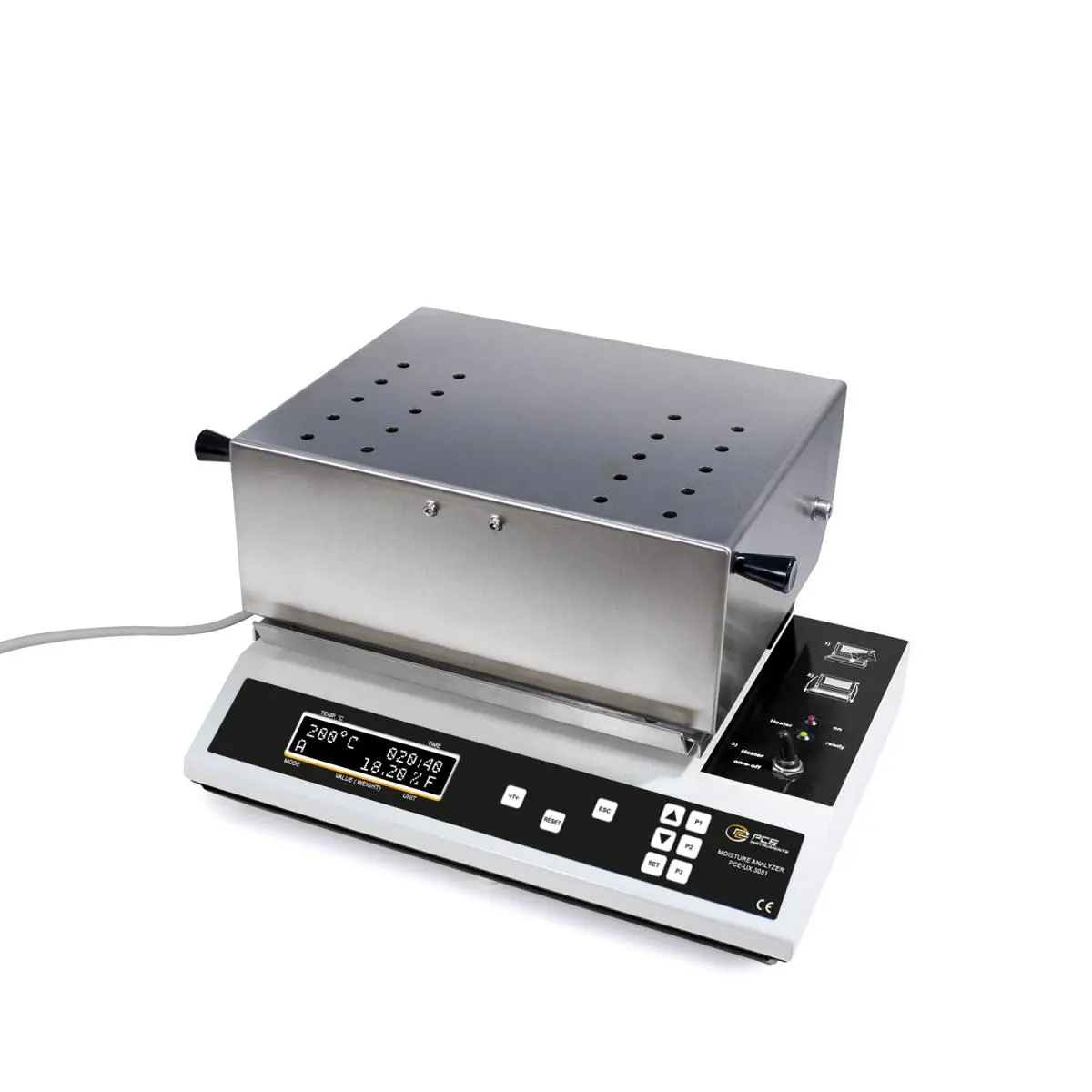 Mit einer maximalen Einwaagekapazität von 400 g, einem Volumen von 360 cm³ und einer hohen Messauflösung von 0,001 g ermöglicht der Feuchtemesser (Abs.) präzise und zuverlässige Feuchtemessungen. Die Waage arbeitet nach dem Prinzip der Trocknung bei gleichzeitigem Wiegen: Der Gewichtsverlust wird kontinuierlich erfasst und als prozentualer Anteil der Gesamtmasse angezeigt. Ausgestattet mit einer Strahlerleistung von 2 x 250 W und einer einstellbaren Heiztemperatur von 40 °C bis 220 °C bietet der Feuchtemesser (Abs.) eine schnelle und flexible Trocknung der Proben. Für die Analyse stellt das Gerät verschiedene Parameter bereit, darunter % Feuchte, % Trockenmasse, % Feuchte ATRO sowie g Restgewicht/kg und Restgewicht.