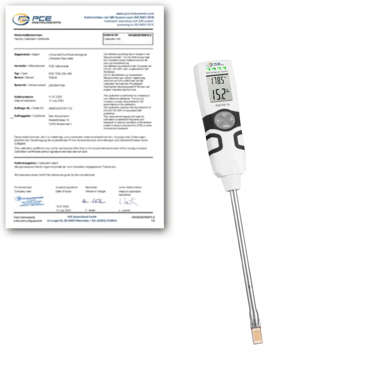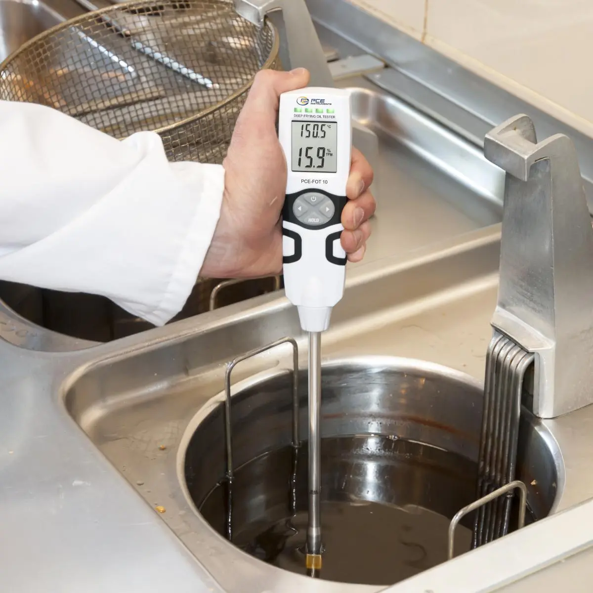 Der Frittieröltester / Speiseöl-Prüfgerät ist ein Messgerät, mit dem Sie die Qualitätsbestimmung verschiedener Ölsorten vornehmen können. Dieser Frittieröltester / Speiseöl-Prüfgerät ist auch bei Lebensmittelkontrolleuren erfolgreich im Einsatz. Eine Messung wird direkt im heißen Fett durchgeführt. Dazu wird die Messspitze direkt in eine Friteuse oder ähnliches gehalten. Somit sind schnelle Messergebnisse garantiert. Dabei wird die Öltemperatur in °C und die Ölqualität in Prozent PC (Polar Compounds = polare Anteile) innerhalb weniger Sekunden ermittelt.