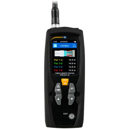 abhängig vom der Ausbreitungsgeschwindigkeit der getesteten Kabel 5 ... 3000 m bei Verkürzungsfaktor ≤99,9 % 5 ... 2400 m bei Verkürzungsfaktor ≤80,0 % 5 ... 2000 m bei Verkürzungsfaktor ≤66,0 % 5 ... 1500 m bei Verkürzungsfaktor ≤50,0 % |