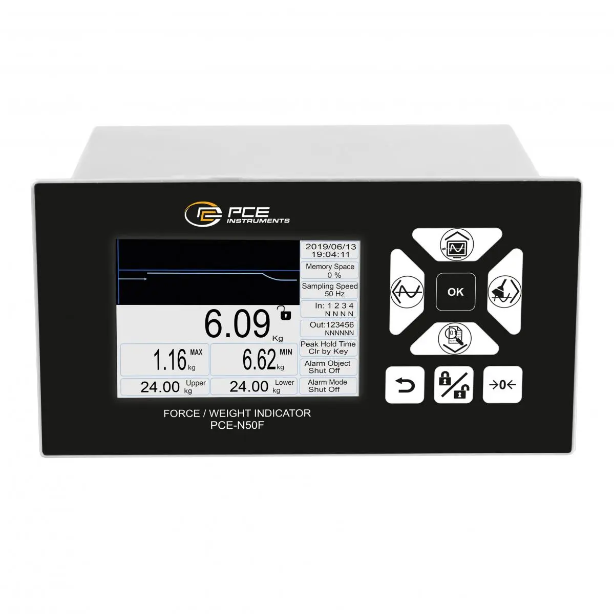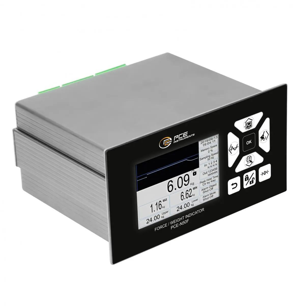 Das Wägeterminal PCE-N50F ist für den Schalttafeleinbau geeignet. Dieses Wägeterminal kann verwendet werden um das Gewicht, die Kraft oder ein Drehmoment anzuzeigen. Ausschlaggebend hierfür ist die Art des Sensors, die an das Wägeterminal angeschlossen wird. Die Kalibrierung vom Wägeterminal auf die jeweilige Messzelle wird über das Menü mit Hilfe von exakten Kalibriergewichten vorgenommen. Das Wägeterminal wird für stationäre und inidividuelle Wägelösungen eingesetzt. Oft kommt das Wägeterminal dort zum Einsatz wo kontinuierlich das Gewicht ermittelt werden muss.