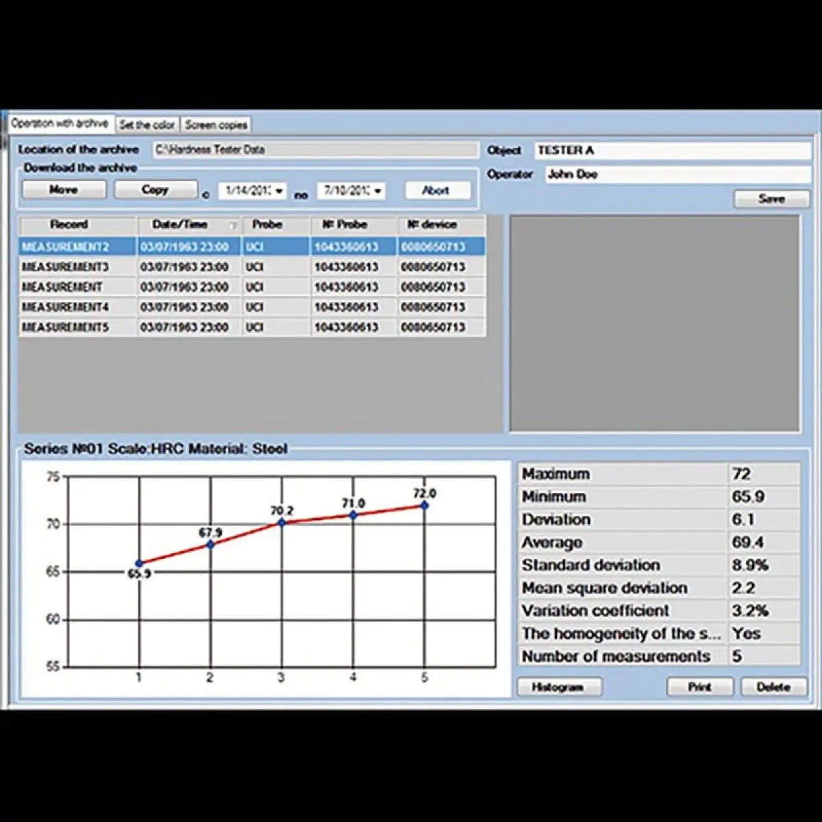 Nach Vermessung der Härte eines Bauteils zeigt das Materialprüfgerät verschiedene Statistikwerte wie Min./Max. und Durchschnittswerte an. Ebenso können Standardabweichnung und weitere Koeffizienten ermittelt werden, auch die Darstellung eines Histogramms ist möglich. Da das Materialprüfgerät über einen internen Speicher verfügt, kann die Auswertung der Messdaten nach der Messung über eine Software erfolgen. Der Download-Link zur Software befindet sich in der Bedienungsanleitung.