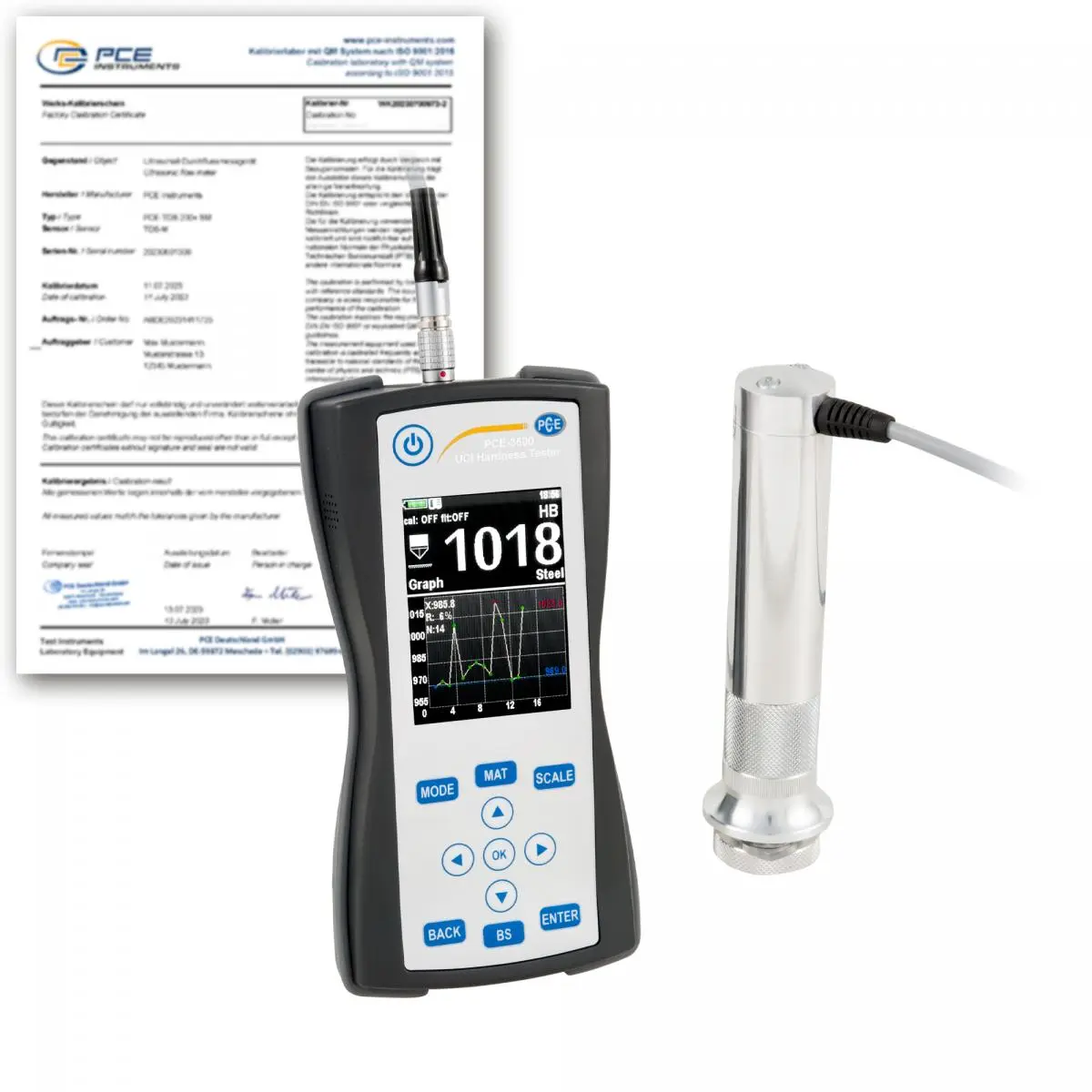 Das Materialprüfgerät dient der zerstörungsfreien Härtemessung von metallischen Bauteilen. Das Materialprüfgerät arbeitet nach dem Ultrasonic-Contact-Impedance Verfahren. Bei dem UCI-Verfahren wird ein Vickers-Diamant an der Prüfsonde mit Eigenresonanz angeregt. Durch Aufdrücken der Prüfsonde wird die Schwingfrequenz je nach Härte der Oberfläche und in Abhängigkeit vom E-Modul des Werksoffes und der Kontaktfläche gedämpft. Aus der sich ergebenden Frequenzverschiebung kann unter Berücksichtigung einer Werkstoffkennlinie die Härte der Oberfläche ermittelt werden.