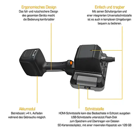 Eine Schiebekamera dieser Serie wiegt mit Kameraeinheit und Akku komplett nur wenig mehr als zwei Kilogramm und ist mit einer Hand bequem zu halten. Mit derselben Hand können der Joystick und fast alle Funktionstasten bedient werden, während das Endoskopkabel mit der anderen Hand vorsichtig an die gewünschte Stelle bewegt wird. Um die Arbeitsbedingungen bei längeren Inspektionen zu verbessern, ist die Schiebekamera mit Befestigungspunkten für Stativ und Schultergurt ausgestattet.