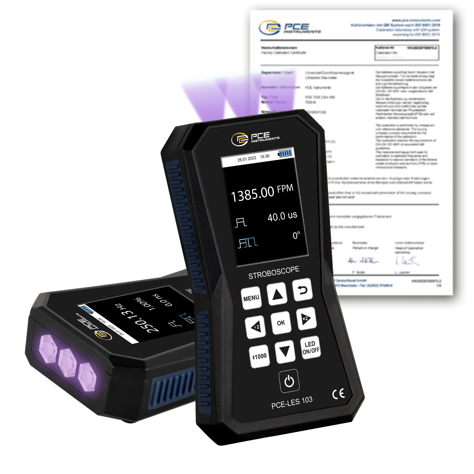 Die Bewegungsanalyse von rotierenden Maschinen ist mit unserem Stroboskop schnell und einfach möglich. Das Stroboskop ist mit 3 Hochleistungs-UVA-LEDs (385 nm) ausgestattet, die zusammen eine Lichtintensität von 317 μW/cm² in 30 cm Entfernung erzeugen. Das Stroboskop ermöglicht die Einstellung der Blitzfrequenz in FPM und Hz. Das Stroboskop ist Pocket Size klein und durch den Akku auch Netzunabhängig.