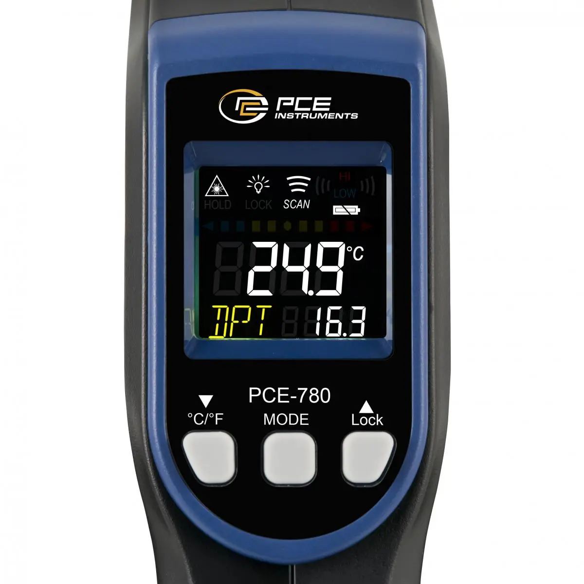 Das Wandfeuchte Messgerät besteht aus einem Infrarotthermometer und einem integriertem Feuchtigkeitsmesser. Mit diesen zwei Sensoren lassen sich Werte aufnehmen mit denen dieses Wandfeuchte Messgerät den Taupunkt ermittelt. Wird dieser Taupunkt erreicht bzw. unterschritten besteht die Gefahr dass sich Feuchtigkeit absetzt und somit auch von Schimmelbefall. Der Taupunkt, welcher vom Wandfeuchte Messgerät berechnet wird, wird im Hochkontrastdisplay angezeigt. Über die Bedientasten können am Taupunkt Scanner Alarmwerte festgelegt werden. Werden die Oberflächentemperaturen über- oder unterschritten, gibt das Wandfeuchte Messgerät einen Warnton wieder und zeigt im Display entweder einen LOW oder HIGH Alarm an.